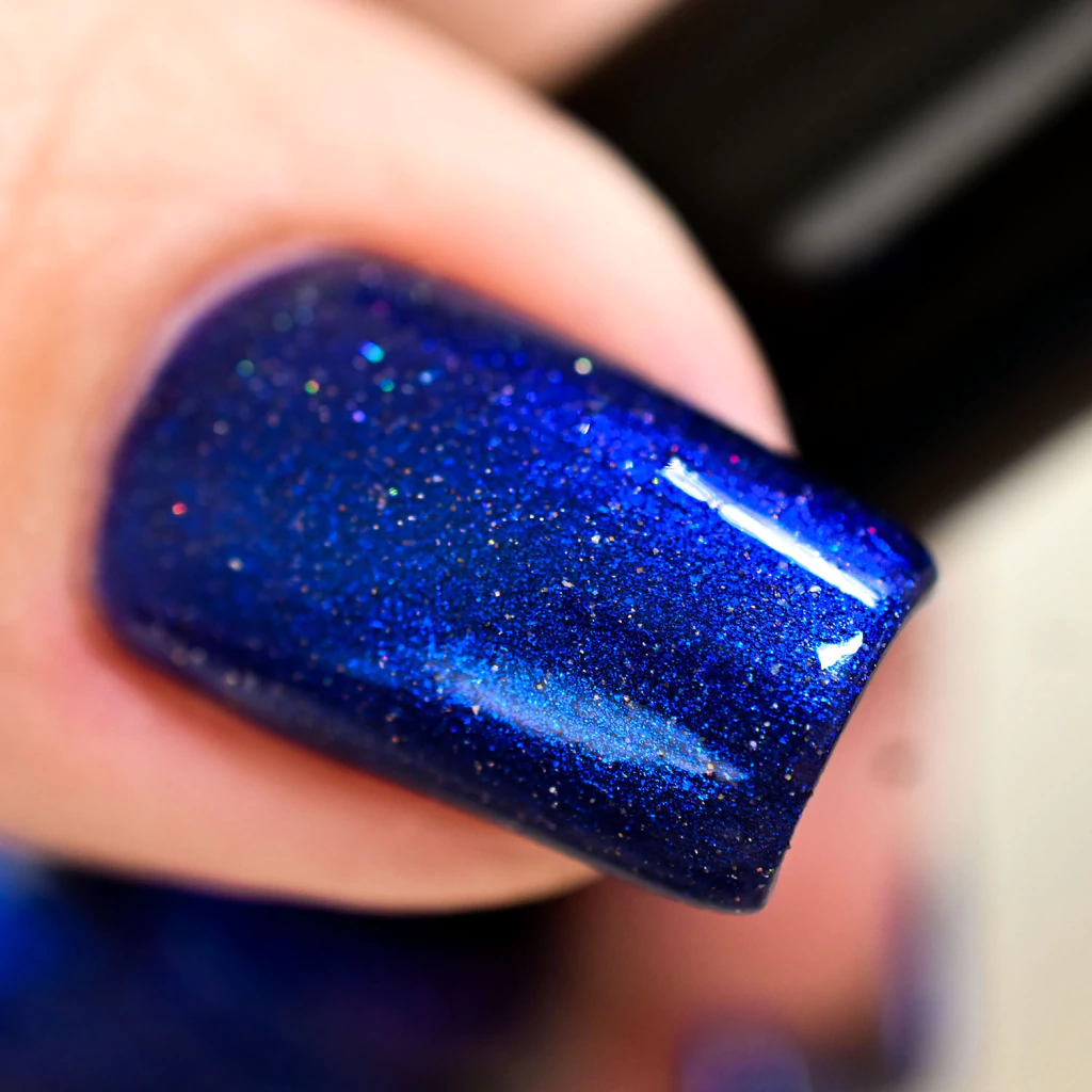 Base azul marinho com intenso shimmer azul e um pouco de glitter prata holo. 10ml.