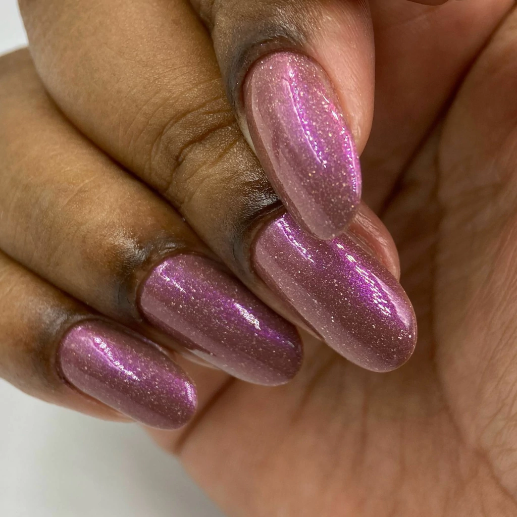 Marrom claro com shimmer roxo/vermelho, pigmento holo e flake holo. 10ml.