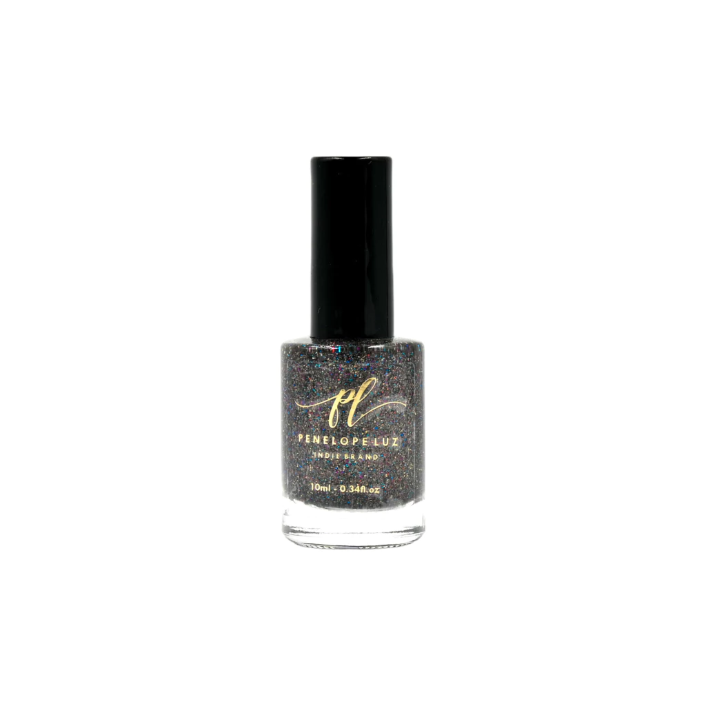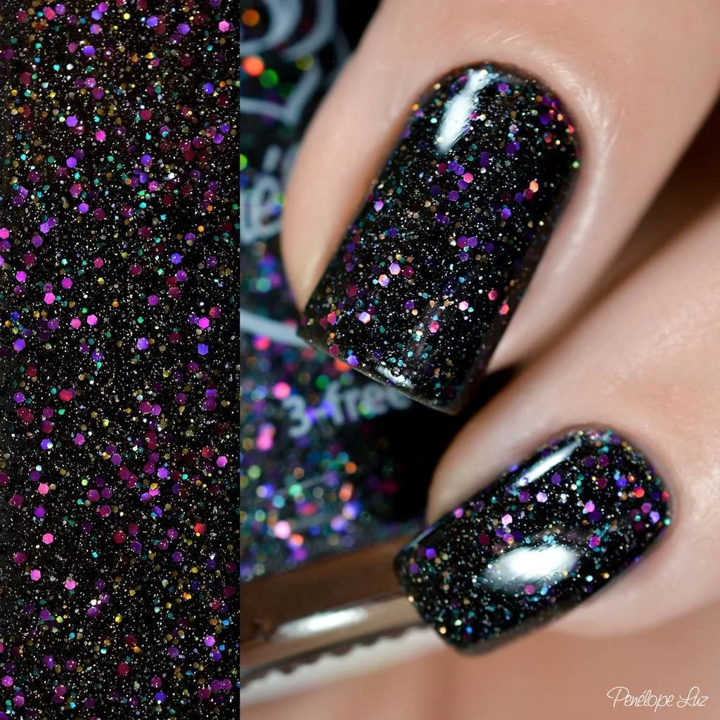 Base preta e glitters holográficos nas cores rosa, teal, lilás e dourado. Além de um pouquinho de pigmento holográfico e glitter holo prata bem fininho. 10ml.