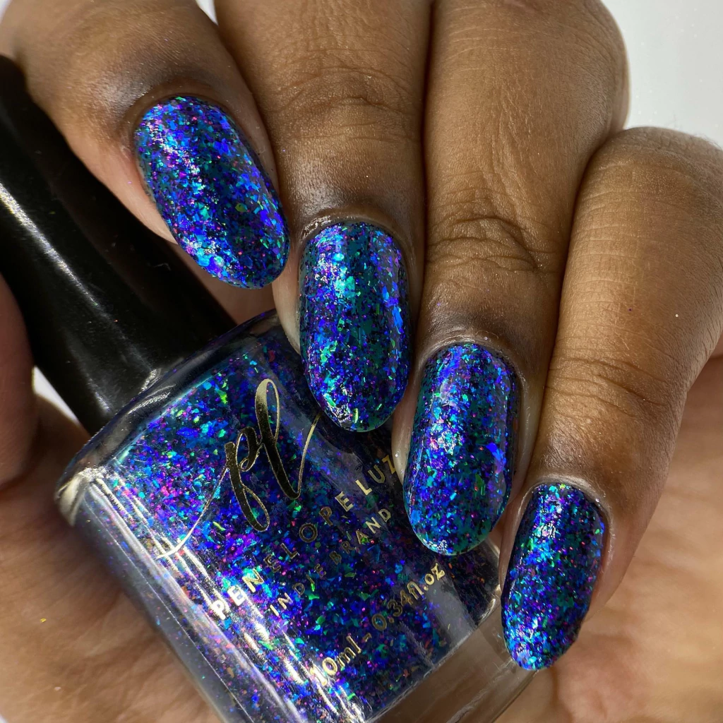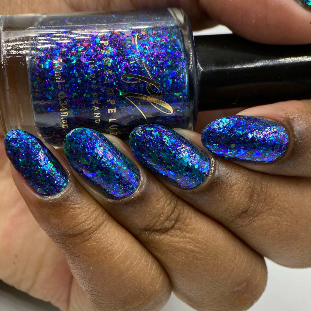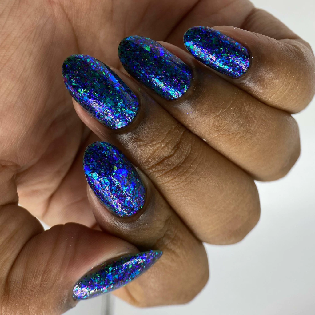 Flocado esplendoroso, que mistura verde, azul e roxo iridescente, com flake preto e azul multichrome. 10ml.
