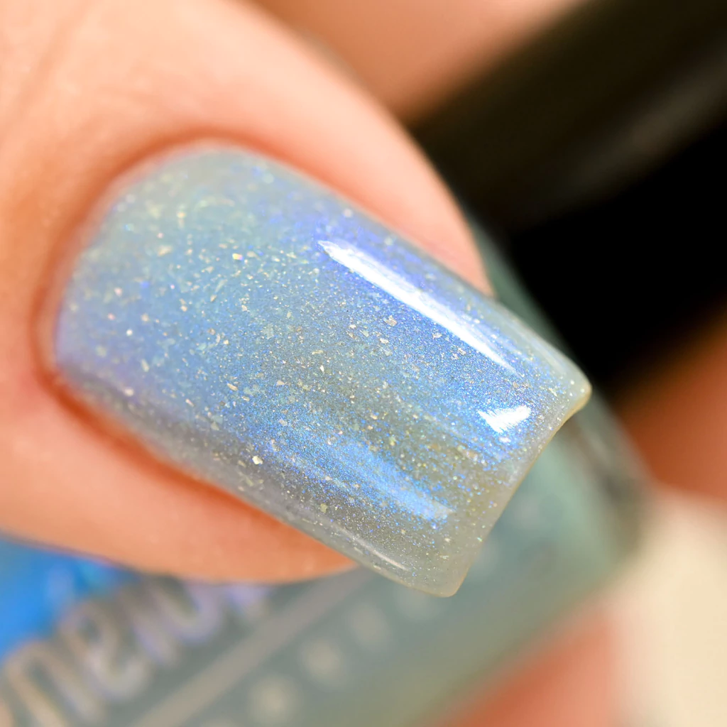 Base turquesa pastel com intenso shimmer azul e um pouco de pigmento e flakie holo. 10ml.