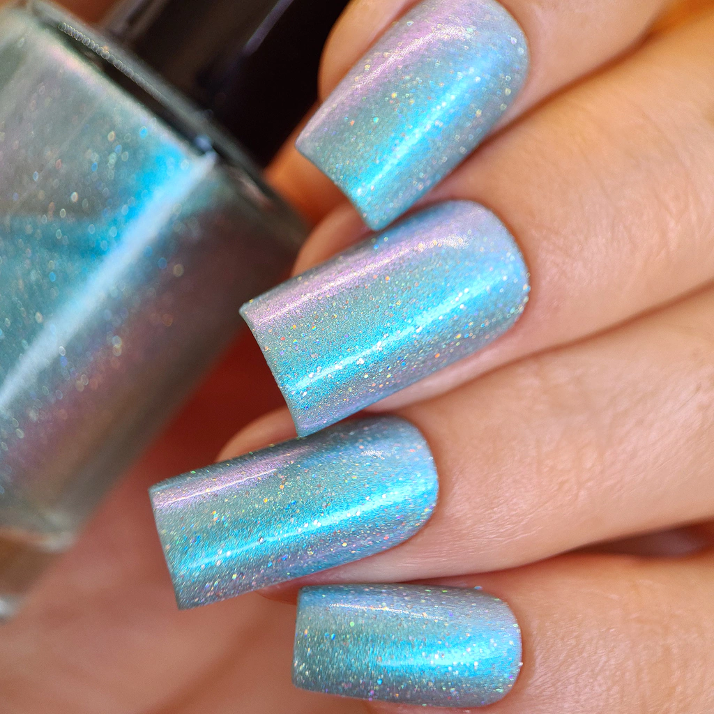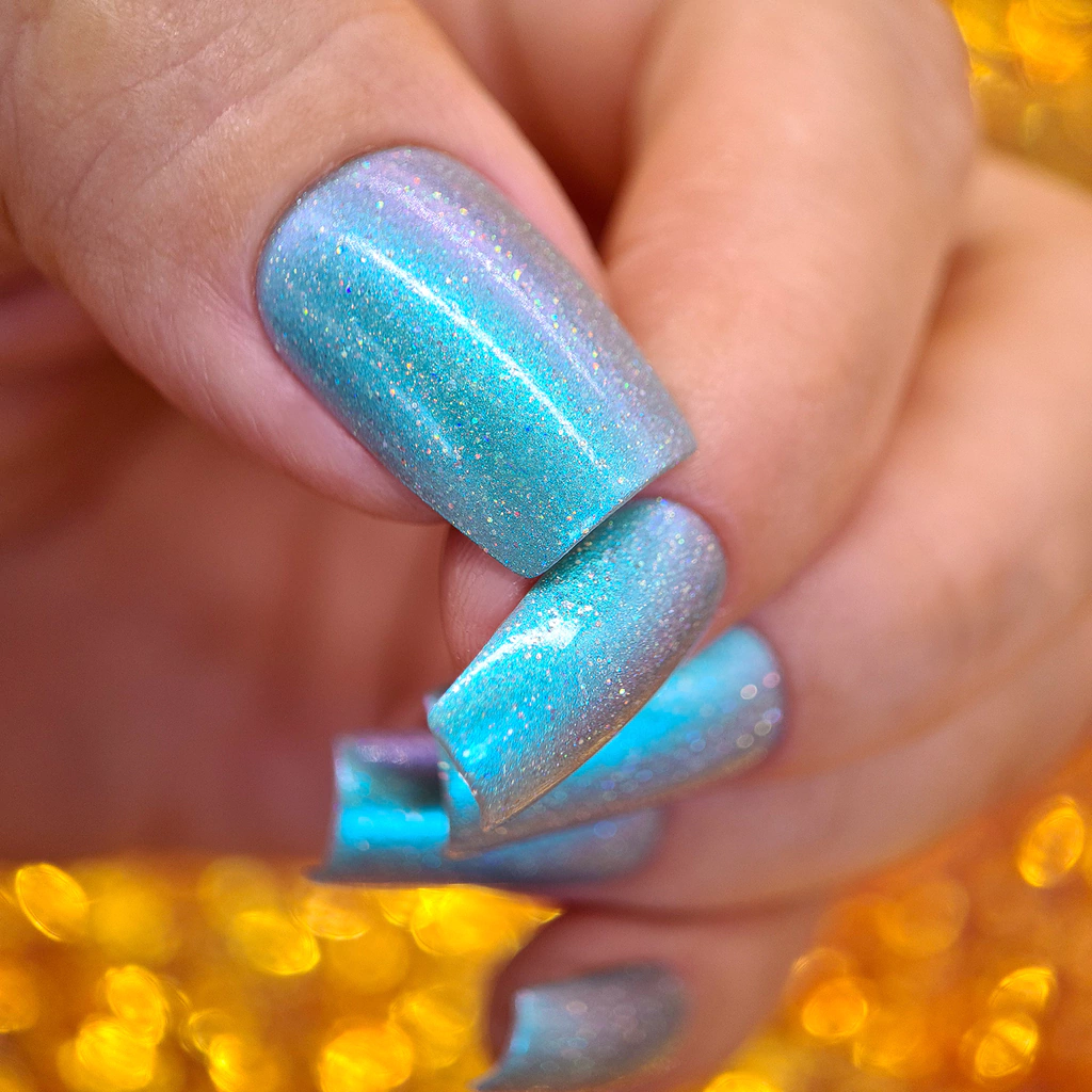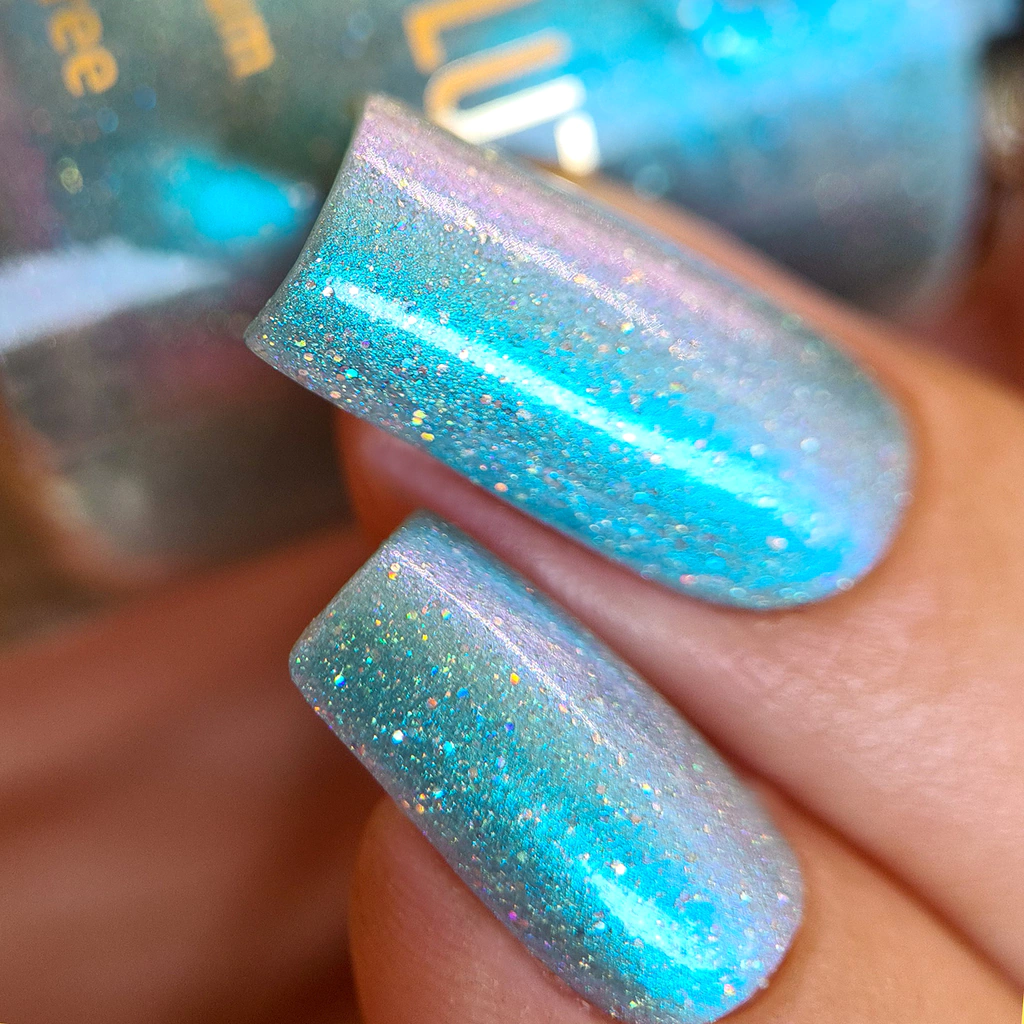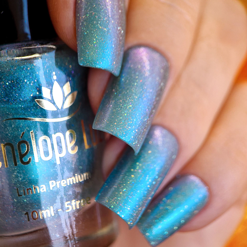 Base turquesa bem clarinha e efeito duochrome que vai do turquesa para o roxo. Tem também glitters galaxy prata holográfico. 10ml.