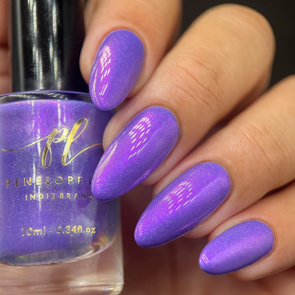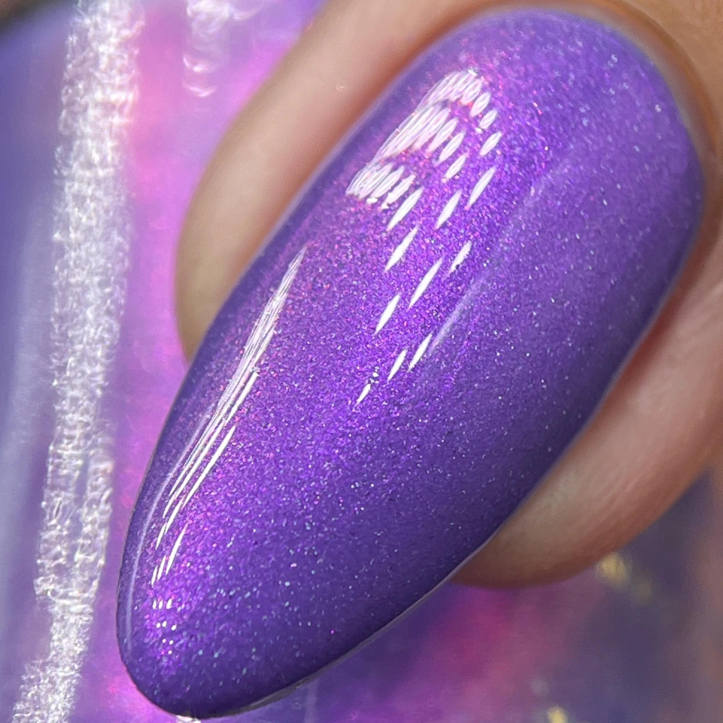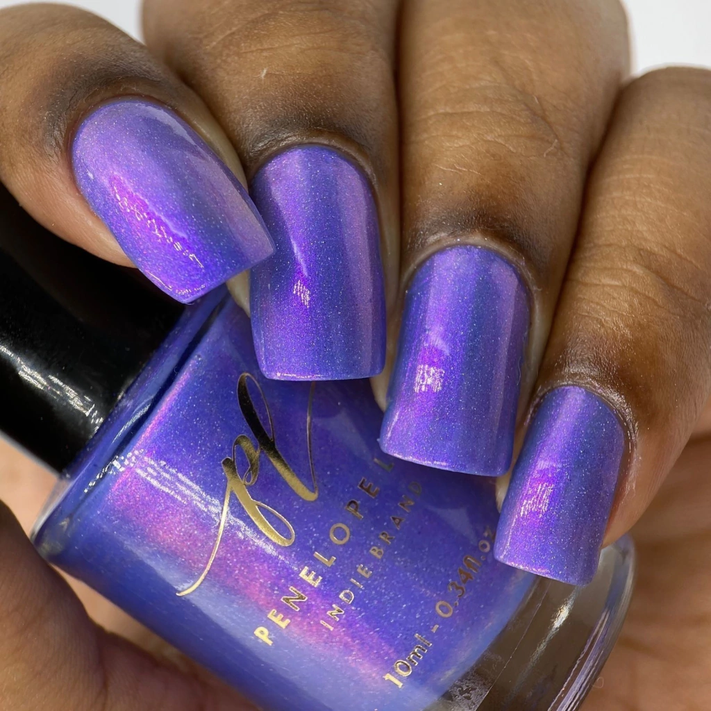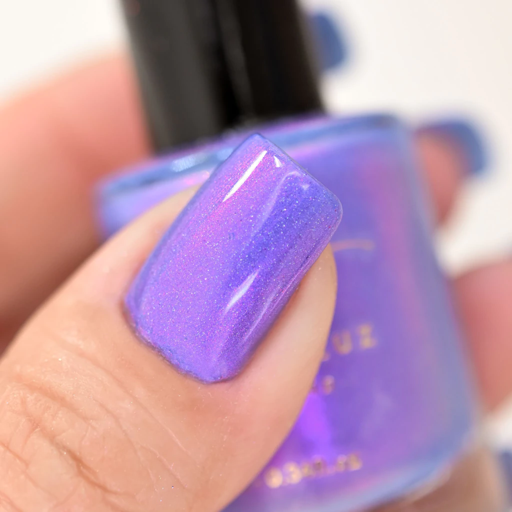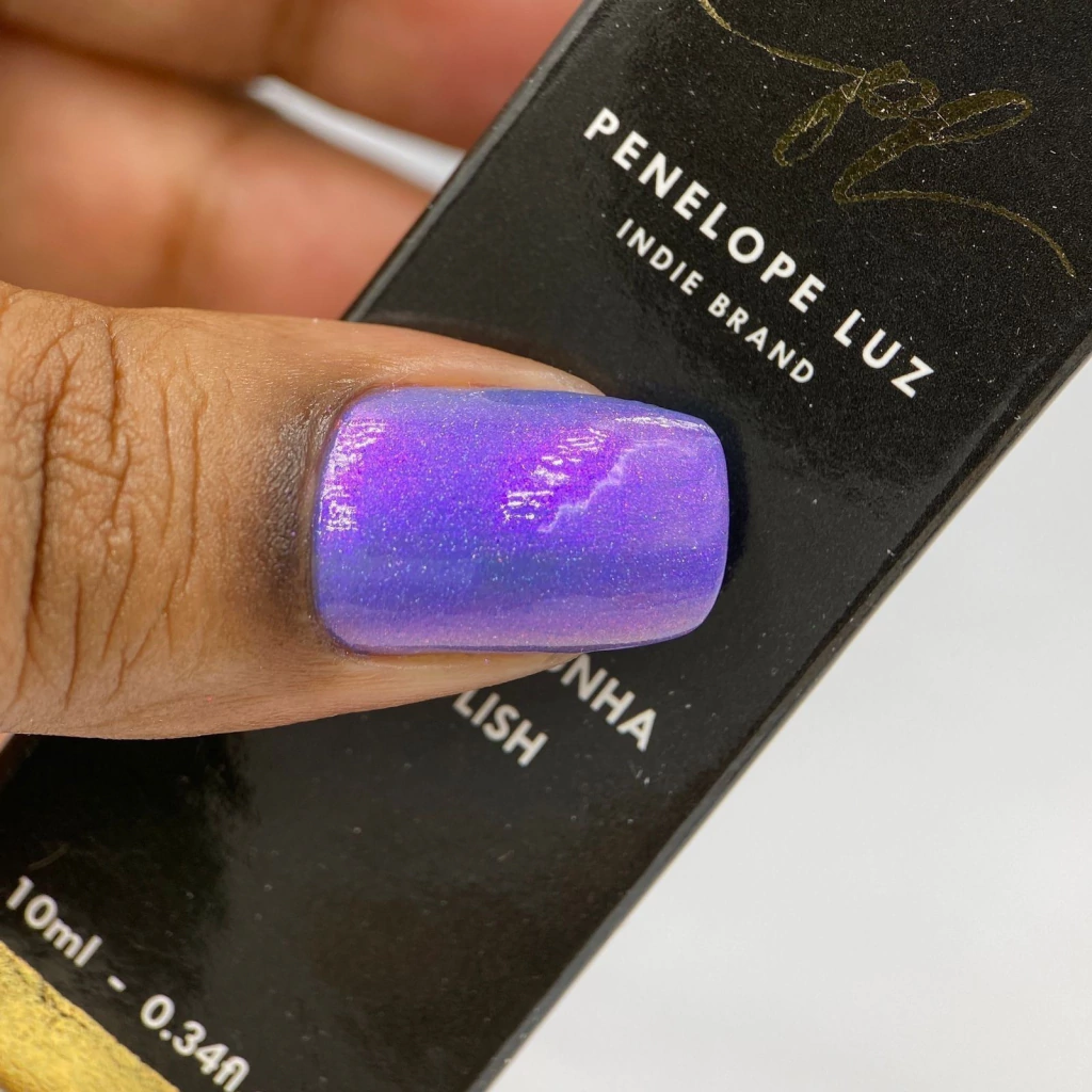 Fundo blurple com aurora roxo/vermelho intenso e um pouco de pigmento holográfico. 10ml.