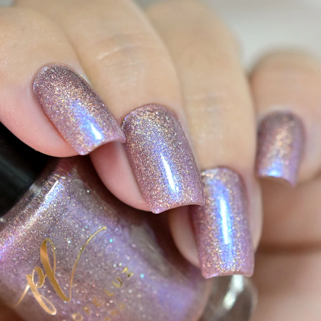 Holográfico bege rosado com pequenos flakies holográficos e aurora azul/roxo. 10ml.