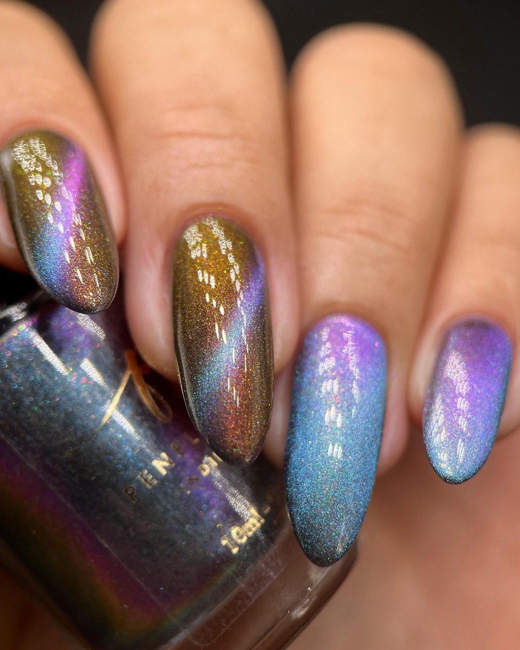 Magnético verde/roxo com microfalkies laranja. 10ml. Esmalte magnético, sendo necessário o imã para criar o desenho. O imã não acompanha o esmalte.