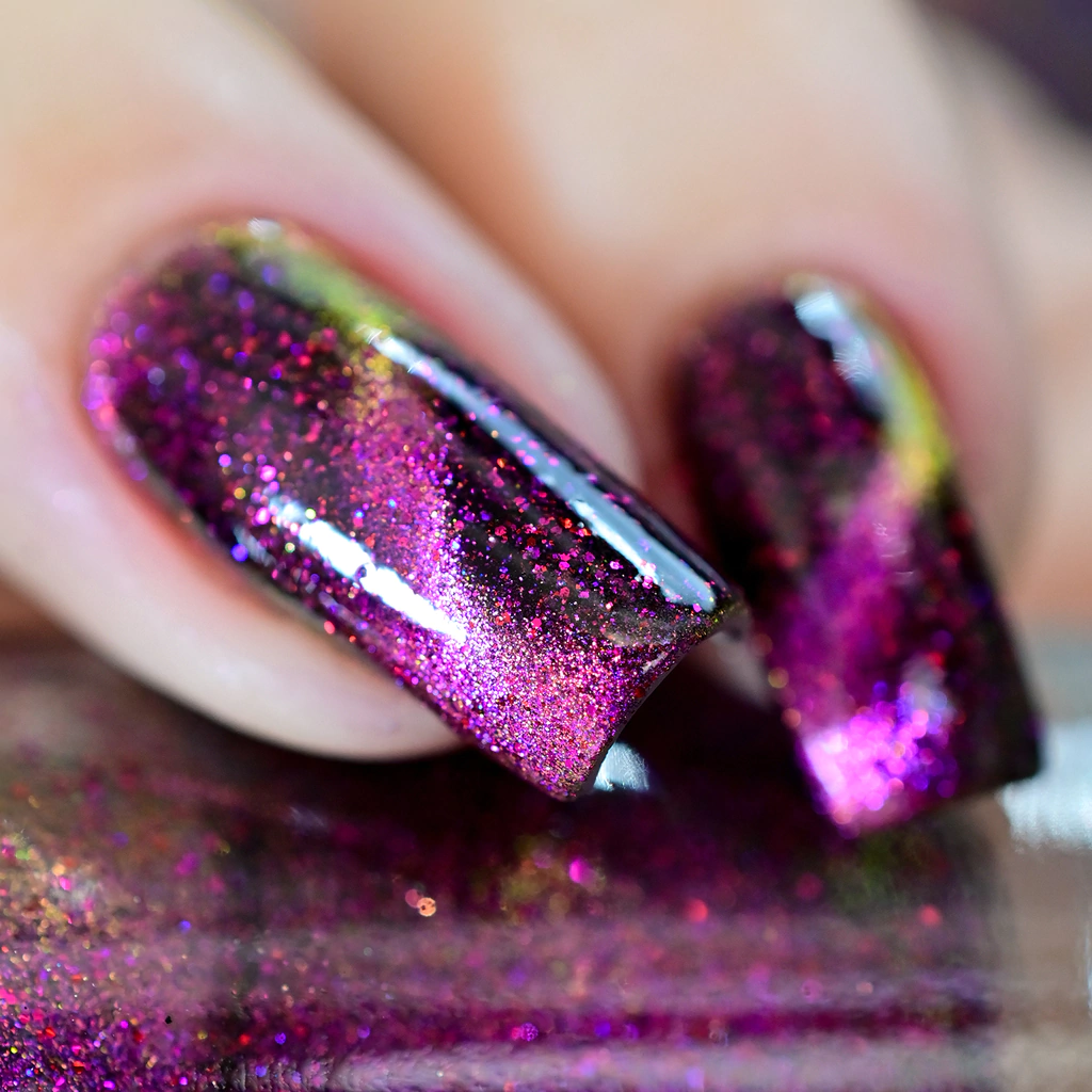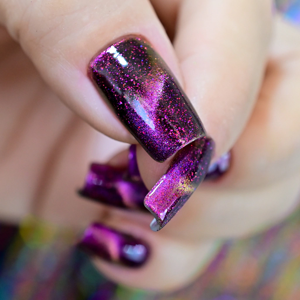 Base vinho, pigmento magnético rosa/dourado e glitters rosa, vermelho e roxo. 10 free.