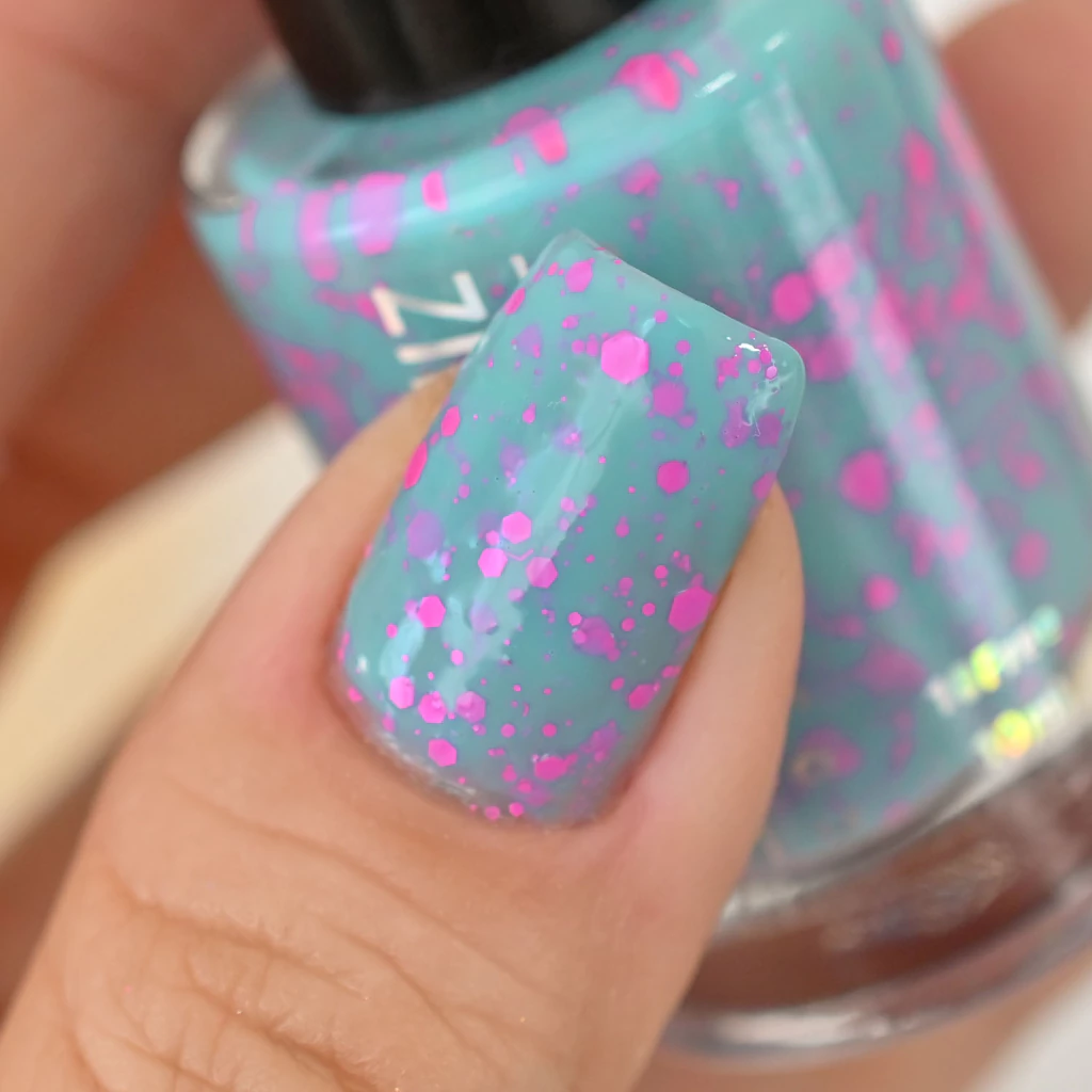 Fundo turquesa clarinho e glitters matte rosa neon. 10ml.