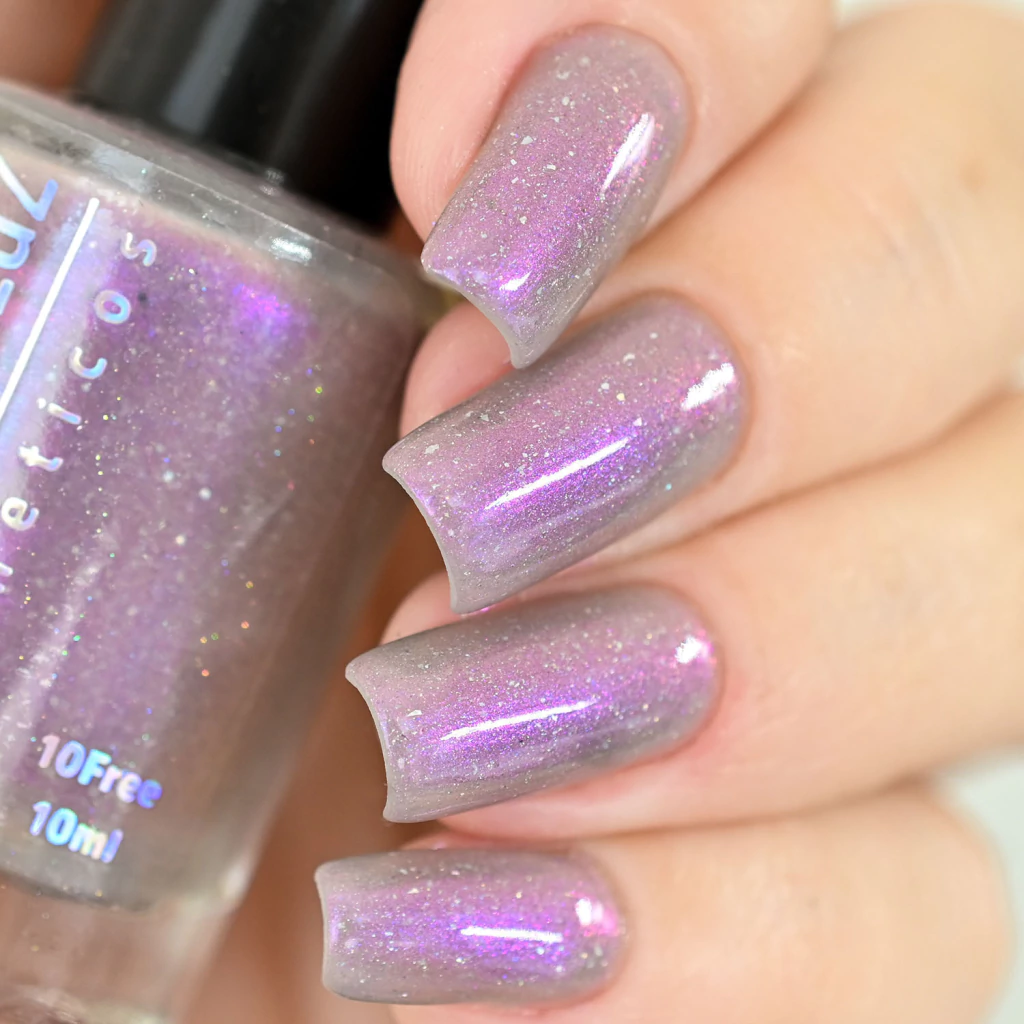 Base cinza pastel com shimmer intenso roxo/vernelho e um pouco de pigmento e micro flakes holo. 10ml.