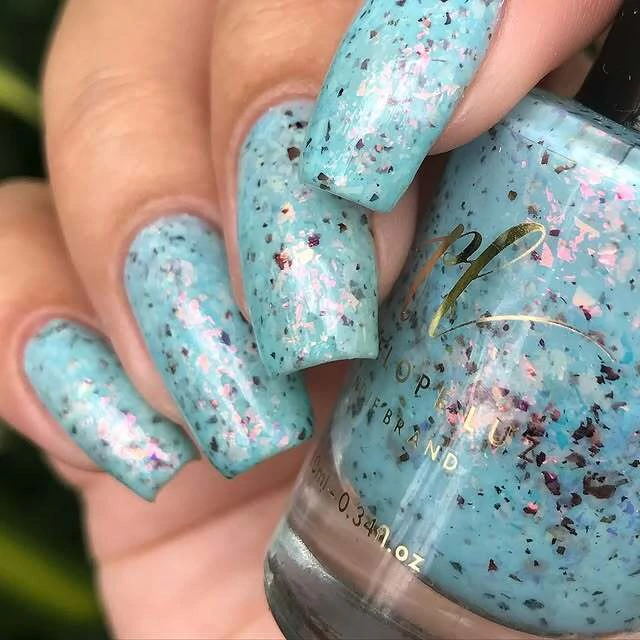 Fundo turquesa pastel e flakes iridescente salmão e multichrome marrom. 10ml.