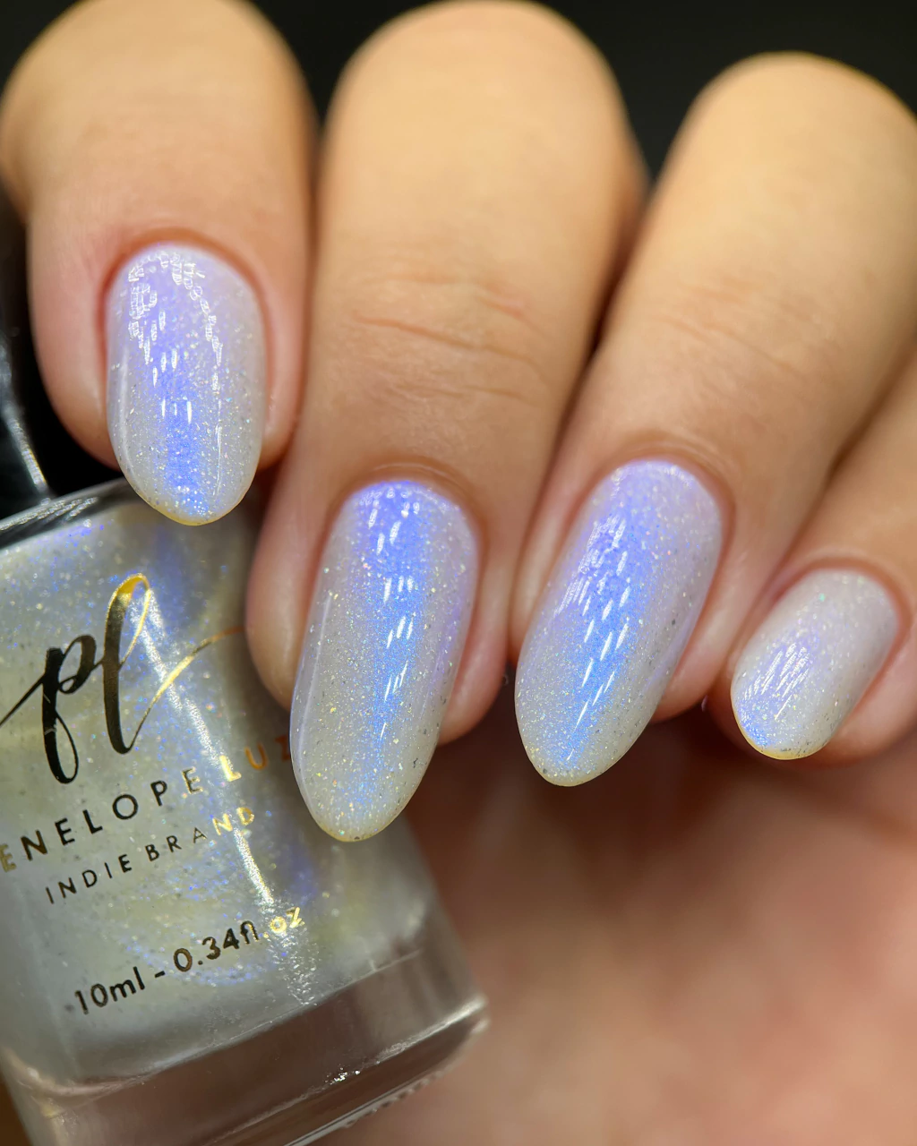 Branco leitoso com intenso shimmer azul/roxo pigmento holográfico e flake holográfico. 10ml.